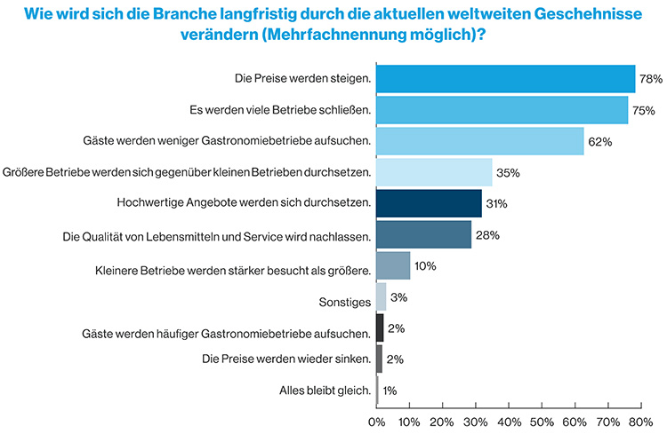 Betont wird vielmehr, dass die Probleme derzeit zu groß und zu viele seien, damit Gastronomen sie alle in die eigenen Hände nehmen könnten. Helfen müsse jetzt hauptsächlich der Staat. So wünschen sich 44 Prozent finanzielle Unterstützungsmaßnahmen, beispielsweise Subventionen oder staatliche Hilfsprogramme. Und 42 Prozent hoffen auf politische Maßnahmen zur Entlastung, wie zum Beispiel durch Unterstützung bei der gesetzlichen Regelung von Pacht- und Mietreduktionen oder Engagement in Branchenverbänden.
