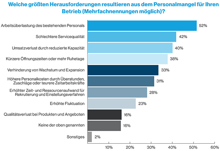 Doch was sind die konkreten Herausforderungen, die durch Personalmangel entstehen? Über die Hälfte der Befragten (52 %) sehen eine Überlastung des bestehenden Personals als gravierendstes Problem an, gefolgt von schlechter Servicequalität (42 %) und Umsatzverlust durch reduzierte Kapazität (40 %).